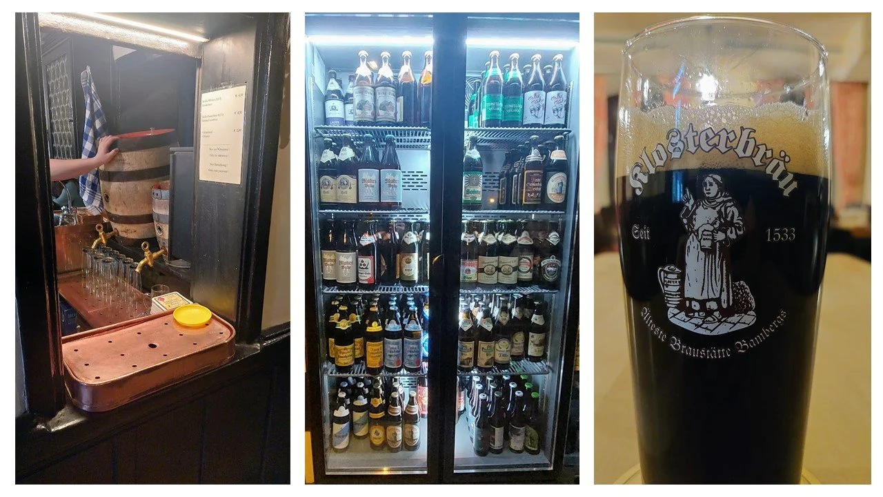 Wood barrels ready for service at Schlenkerla (left). Fridge full of local classics at the Zapfhahn (center). Glass of Schwarzbier at Klosterbräu (right).